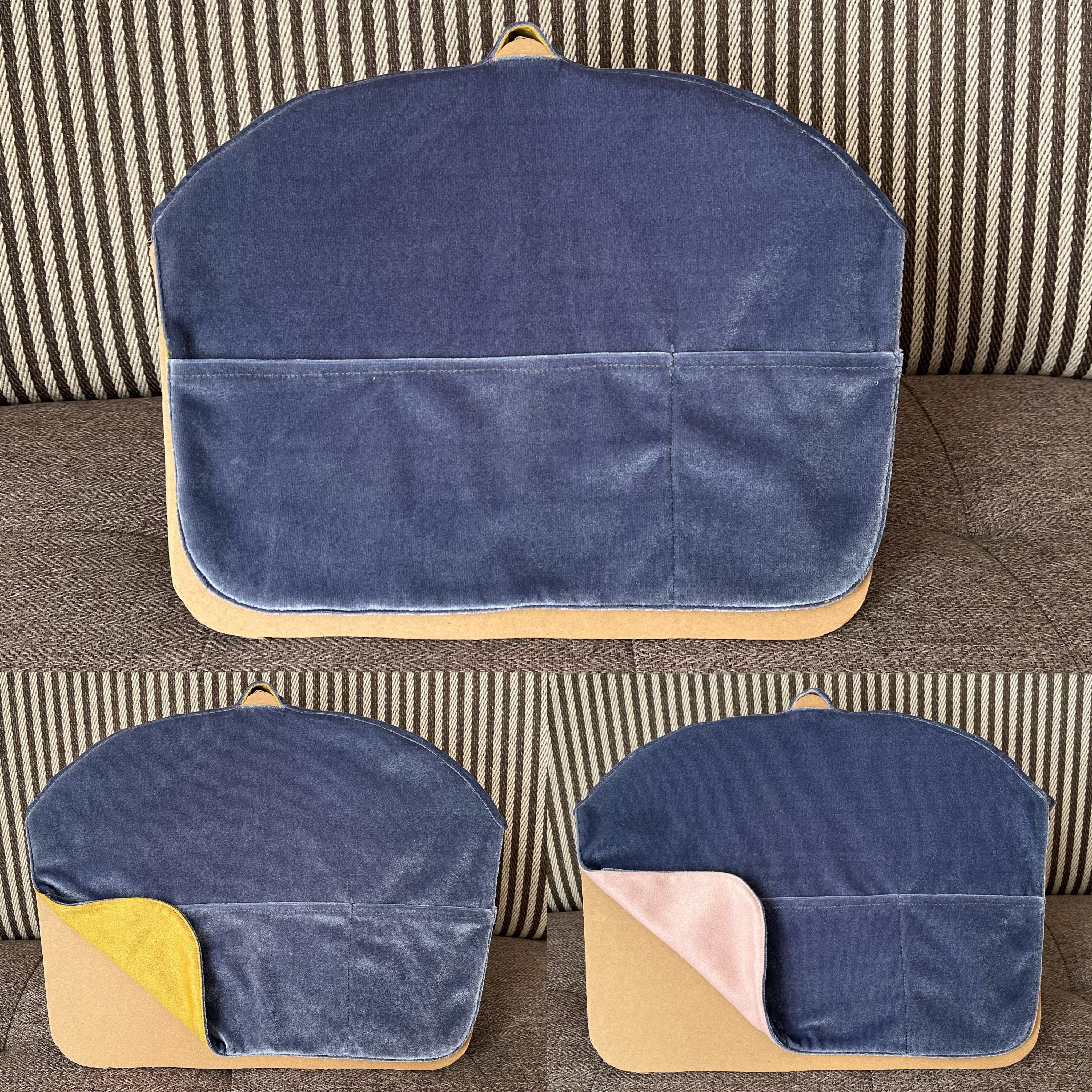 グレーのベロア素材と、柔らかいスウェード調の生地です。