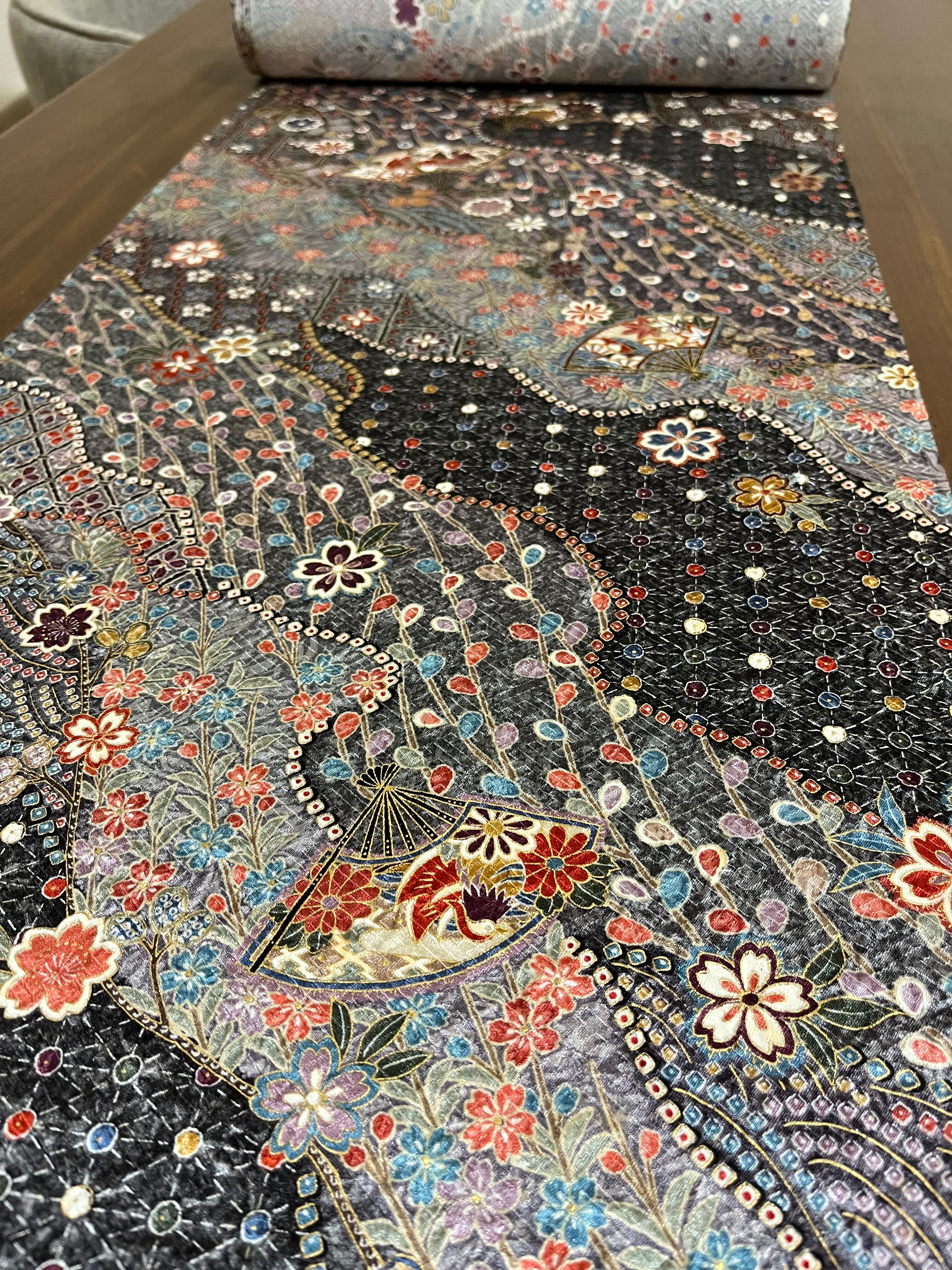 地模様のある生地に桜や季節の花々、扇面などが描かれ、手絞りの風合いが加わった高級感のある生地です。全体的に金色も使われていますが、グレーベースで、シックで大人っぽい印象です。
