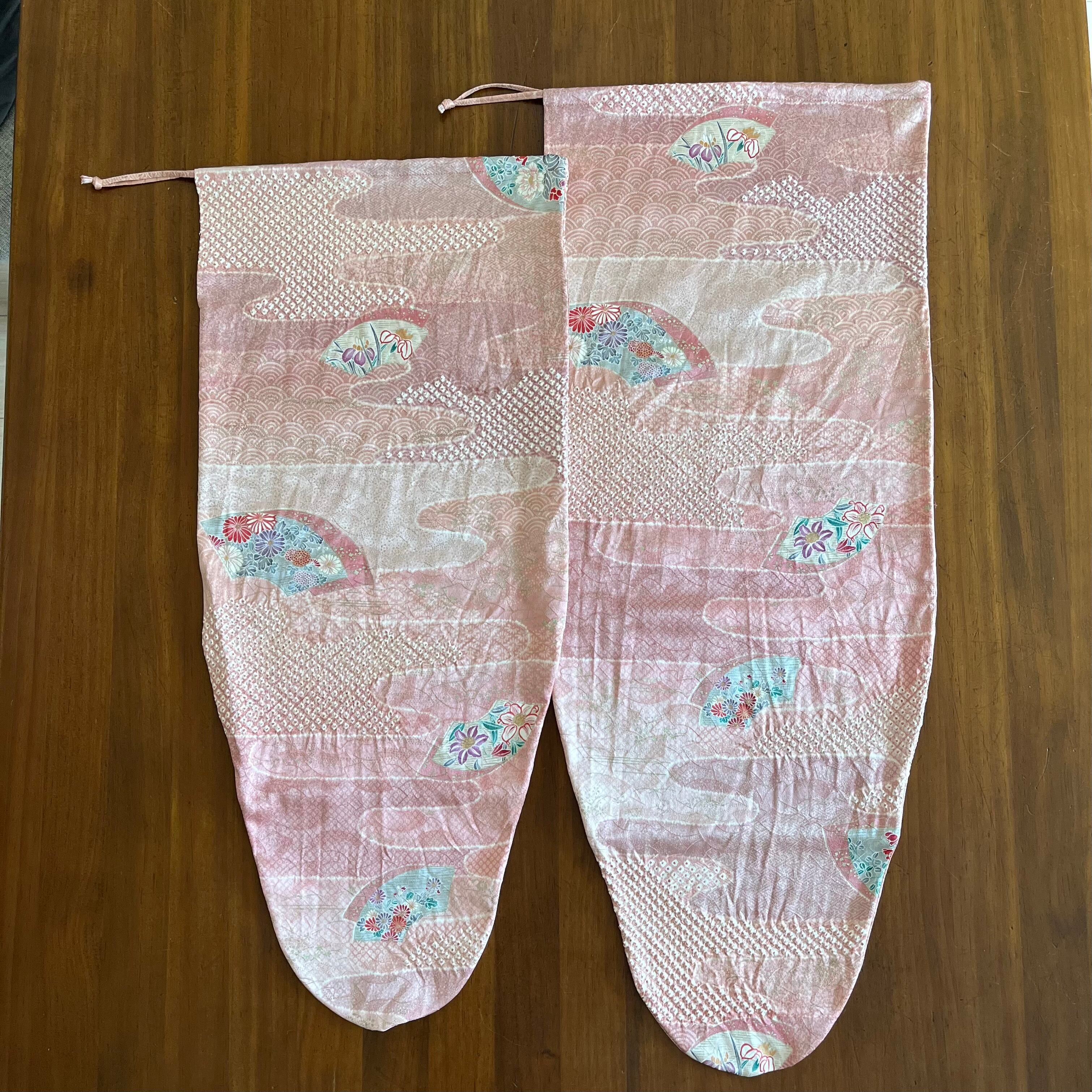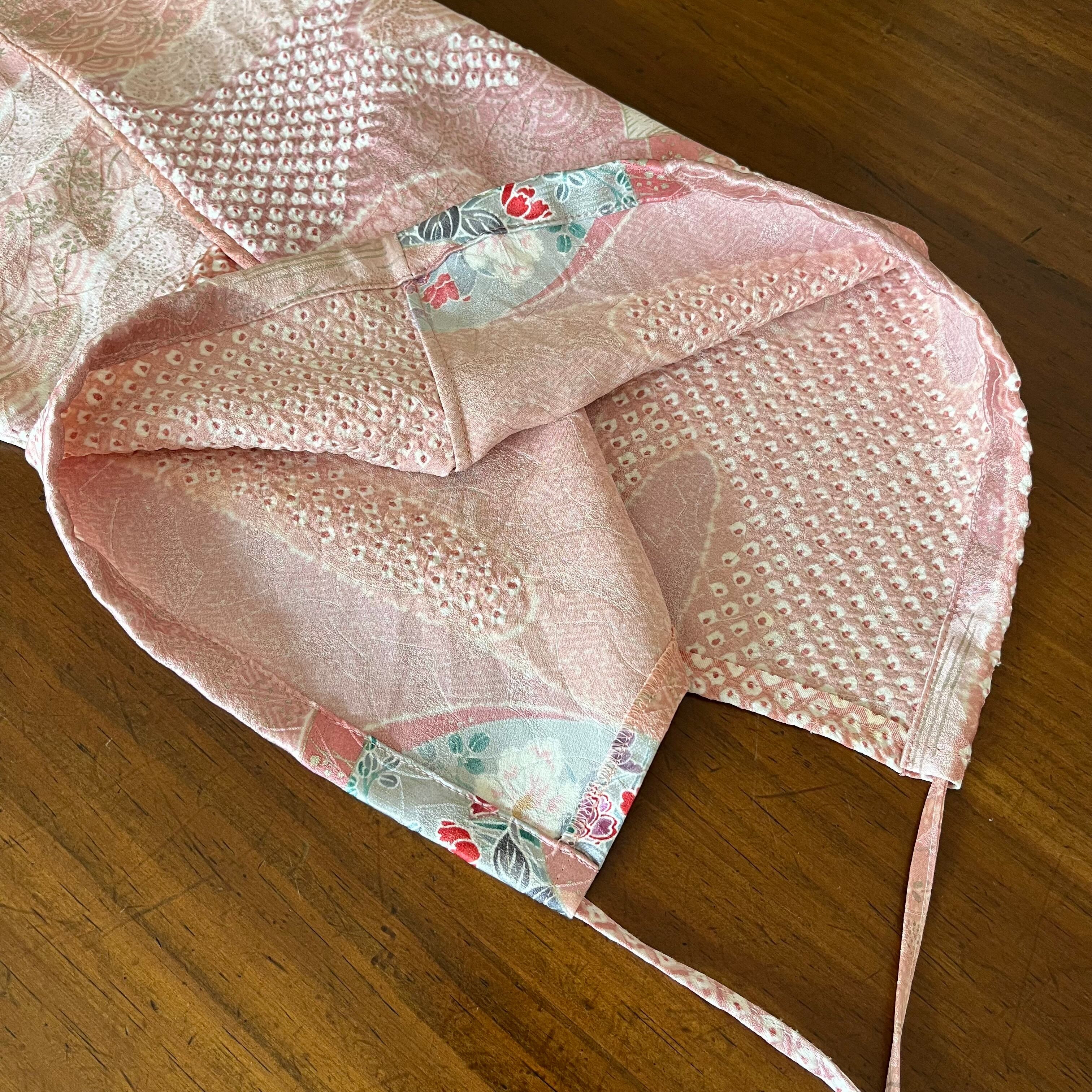 ピンク地の正絹生地に絞りの風合いが良いです。扇面柄や草花など、柔らかい印象があります。